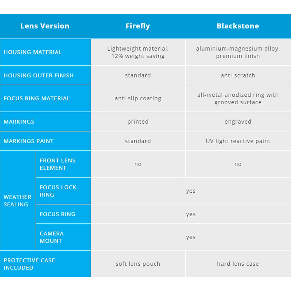 Dieses extrem weitwinklige, geradlinige Objektiv mit manuellem Fokus wurde für DSLR Kameras entwickelt und ist ein extrem weites geradliniges Vollformatobjektiv mit einem Blickwinkel von 126°. 4 hochbrechende Linsen, 2 ED Linsen und 3 asphärische Linsen garantieren eine minimale Verzerrung von nur 3,13% und machen unser 11 mm 1: 4,0 Objektiv absolut einzigartig in seiner Klasse. Jedes Irix Objektiv ist mit einer wetterfesten Konstruktion ausgestattet, die den Innenraum vor Staub und Feuchtigkeit schützt. Dank der inneren Dichtungen sind unsere Linsen auch vor versehentlichem Spritzwasser geschützt. Firefly ist die Standardversion mit drei Gummidichtungen, die die Kamerahalterung und den Fokussiermechanismus vor Staub, Feuchtigkeit und seitlichen versehentlichen Wasserspritzern schützen. Der ergonomische Fokussierring mit Gummigriff bietet die Freiheit, mit der Kamera zu arbeiten. Es ist das leichteste Objektiv seiner Klasse. Bildgröße 35mm „Full Frame“ Brennweite 11mm Sichtfeld 126° (Diagonale) Fokussierbereich 0,275 M (0,9 Ft) ? Fokussiertyp Handbuch mit Sperrfunktion und Fokusbestätigung Blendenbereich F / 4 F / 22 Blendensteuerung über Kamera Öffnungsform 9 Abgerundete Klingen Linsenkonstruktion 16 Elemente in 10 Gruppen 4X Std., 2X Ed., 3X Asp Frontfiltergewinde Nr Hinteres Filtergewinde 30 x 30 mm Abmessung 118 x 100 mm (4,49 „x 4,05“) Gewicht 730 g 790 g